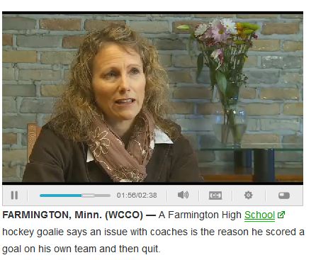 February 13, 2013. LaVoi weighs in on WCCO TV about the high school hockey Farmington goalie quitting mid-game.