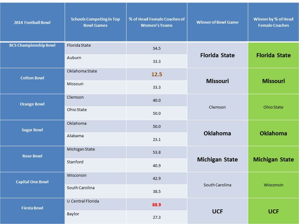 We weighted the score by position, if a woman occupied the position a school earned the following points: Head Coach = 3pts, Associate (Head) Coach = 2pts, Assistant Coach = 1pt. Males in any position earned zero points. We counted only 4 coaching positions for each institution (except for UNC who had 5).