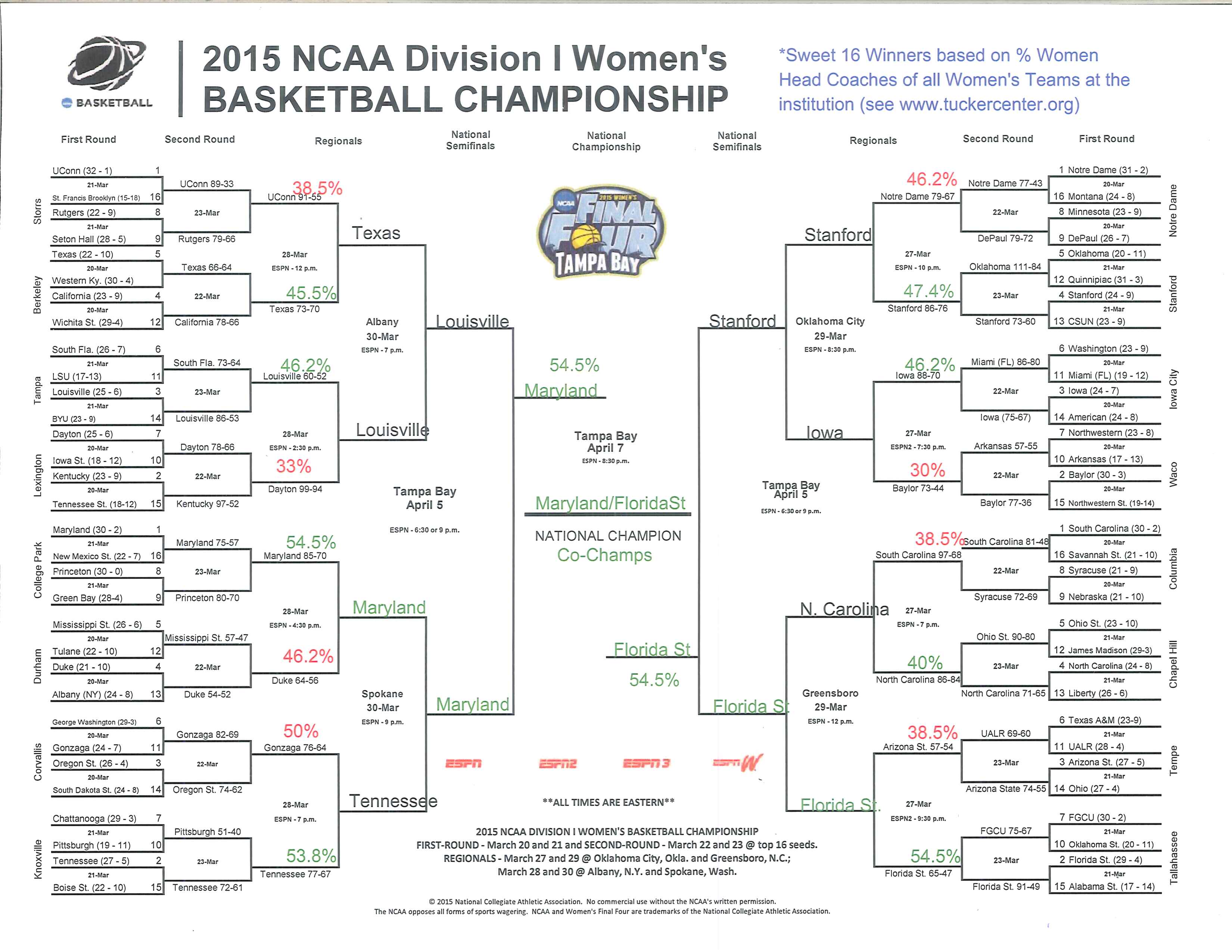 Based on the 2014-15 data in the Women in College Coaching Research Series, I took the remaining 2015 Sweet 16 teams and filled out the bracket based on the percent of women’s teams at that institution which had a female head coach (see Figure 1). With that data, Maryland and Florida State would be Co-National NCAA D-I Champions (coached by Brenda Frese and Sue Semrau respectively), due to the fact 54.5% of all their women’s teams at both institutions are coached by a woman head coach. Madness!